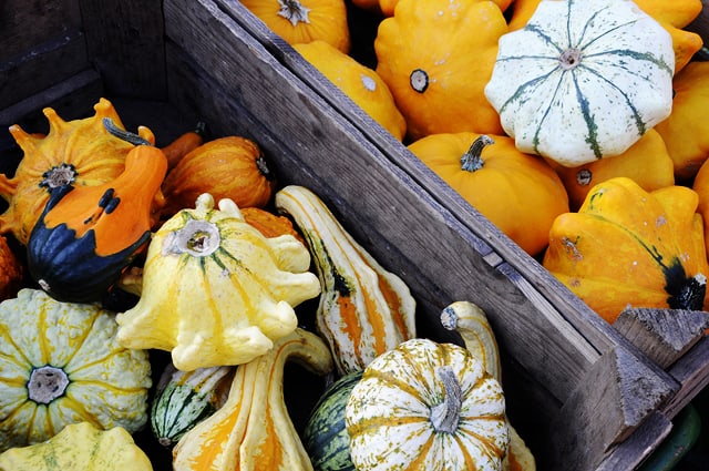 Wie buntes Laub gehören auch Kürbisse in den Herbst und bieten sich auf Märkten als Motive an. Auch für Herbstdekorationen werden die Früchte, die nebenbei bemerkt mit Gurken und Wassermelonen verwandt sind, gern verwendet und können auch hier sehr fotogen sein.