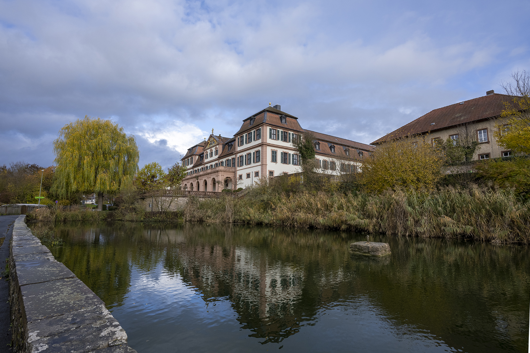Die kürzeste Brennweite des Zooms bringt Tiefe in das Bild. Es zeigt den Weiher und das Kellereischloss („Rotes Schloss“) in Hammelburg.