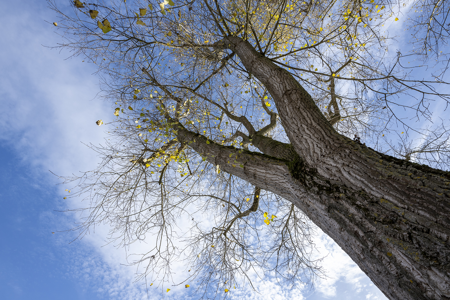 Eine der Pappeln unweit der Redaktion. Ihre Höhe kann man mit 17 mm und steil nach oben gerichteter Kamera gut einfangen.