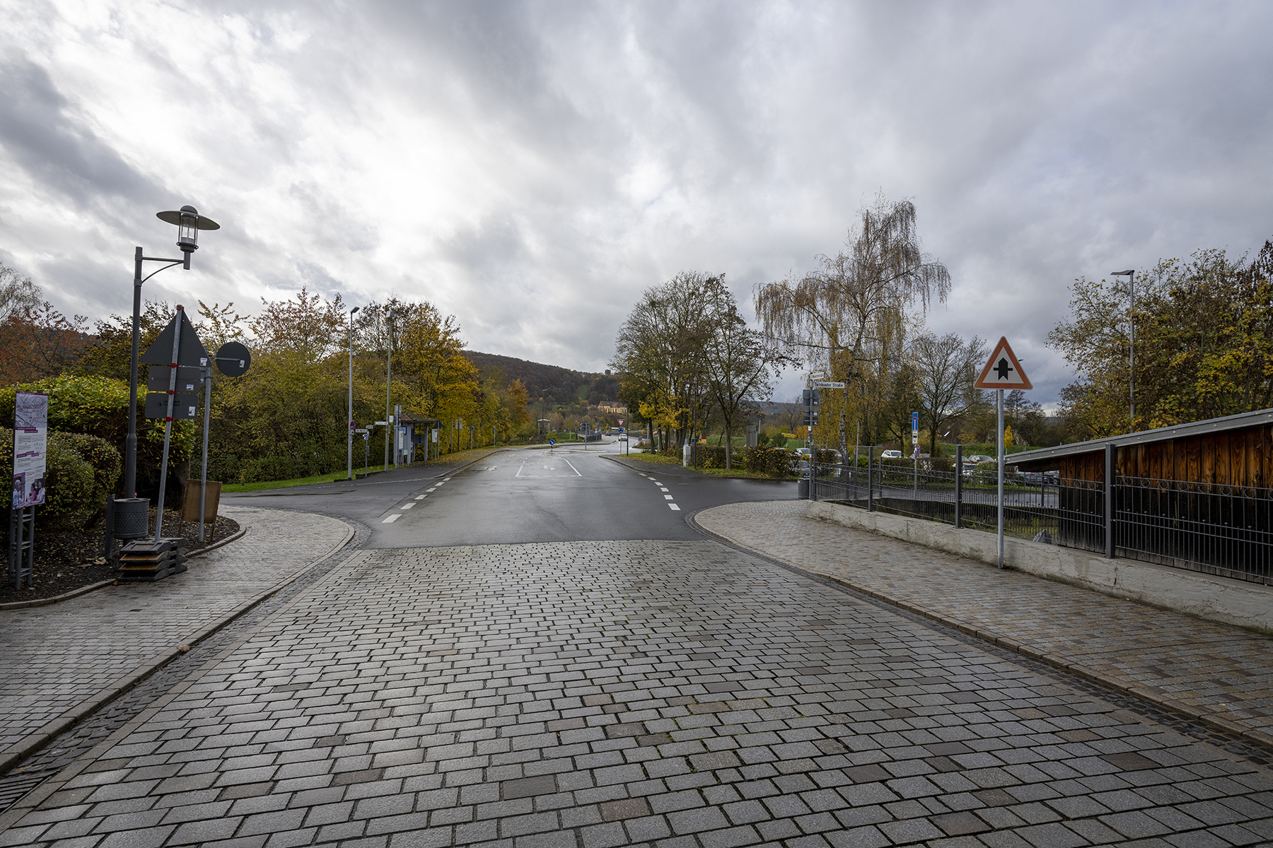 Mit 17 mm führt die Weihertorstraße dynamisch aus Hammelburg hinaus. Weit im Hintergrund Schloss Saaleck, darunter Kloster Altstadt – neben dem sich wirklich eine Musikakademie befindet, während die in den Rosenheim Cops vorkommende nur Fiktion ist!