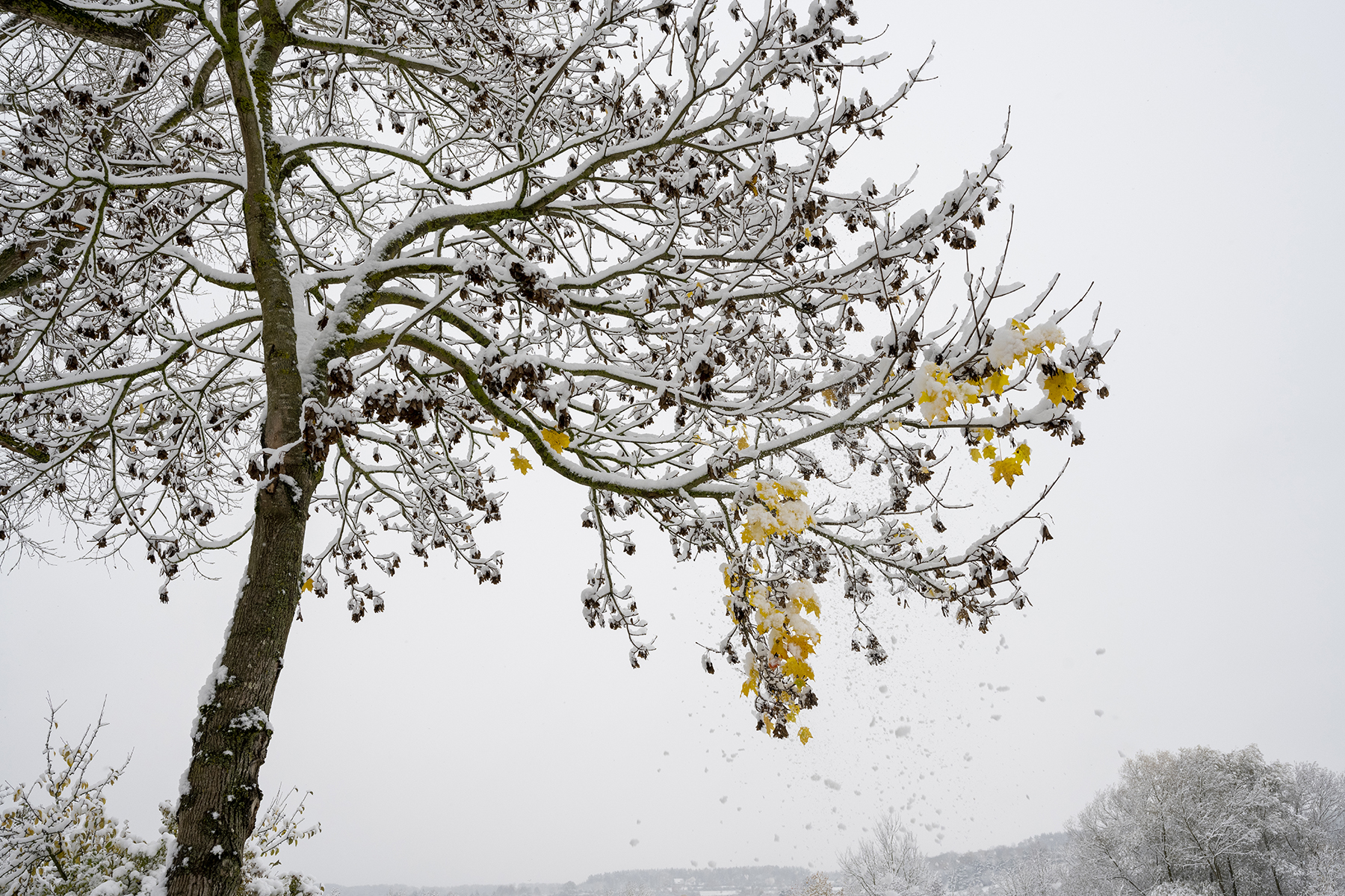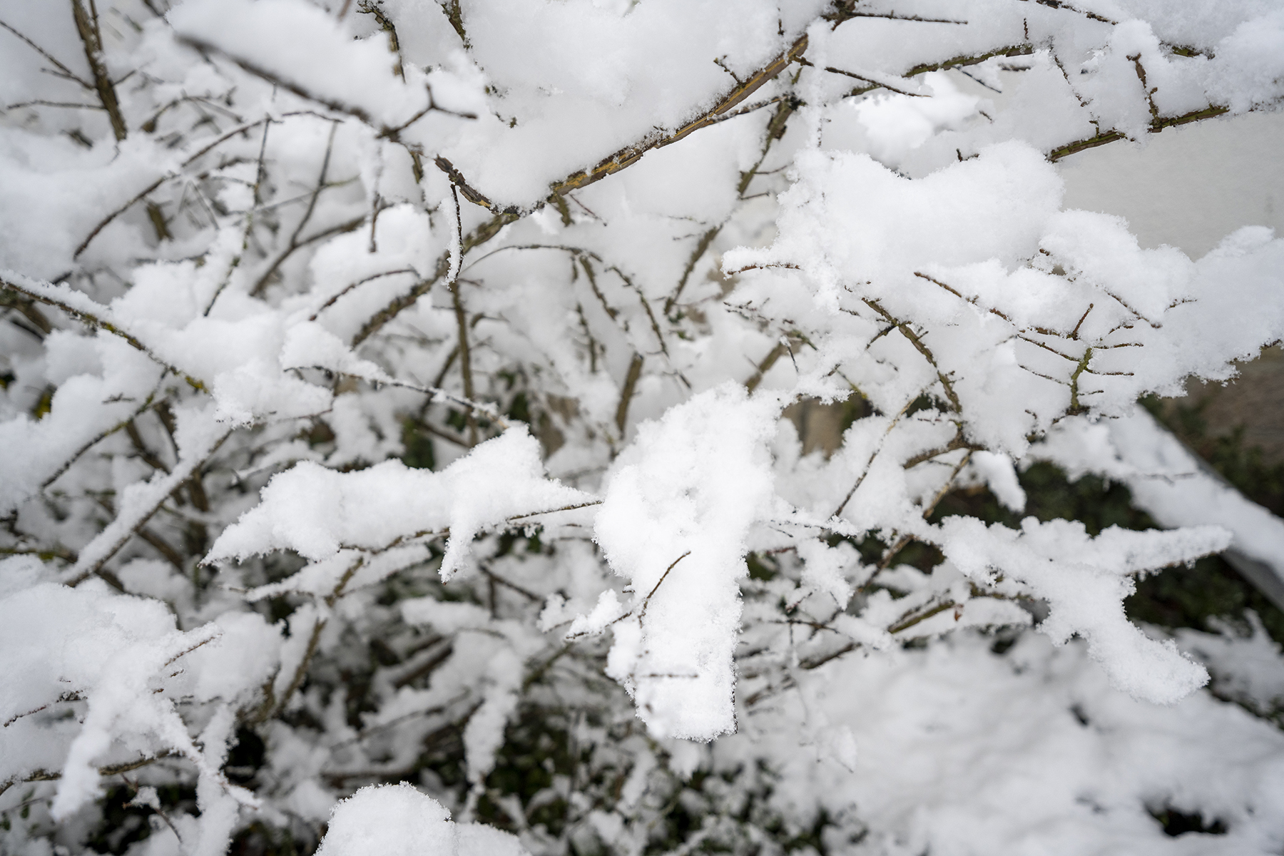 Die Schneeflocken waren sehr fein – aber ein freundlicher Nachbar warf einen Schneeball in die Baum, um mir ein paar größere ins Bild zu bringen.