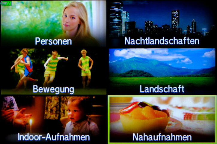 - SCN – Dahinter stecken 22 Motivprogramme in sechs Gruppen, darunter „Gegenlicht HDR“, „Schwenken“ (für Mitziehaufnahmen) und „Multi-Fokus-Aufnahme“ (für eine große Schärfenzone im Nahbereich, die am PC aus acht Aufnahmen zusammengefügt wird)