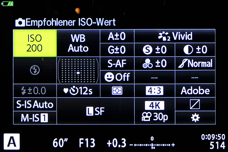 Für den Sensor können ISO-Werte von 200 bis 6400 und im erweiterten Bereich von 64 bis 25.600 eingestellt werden.