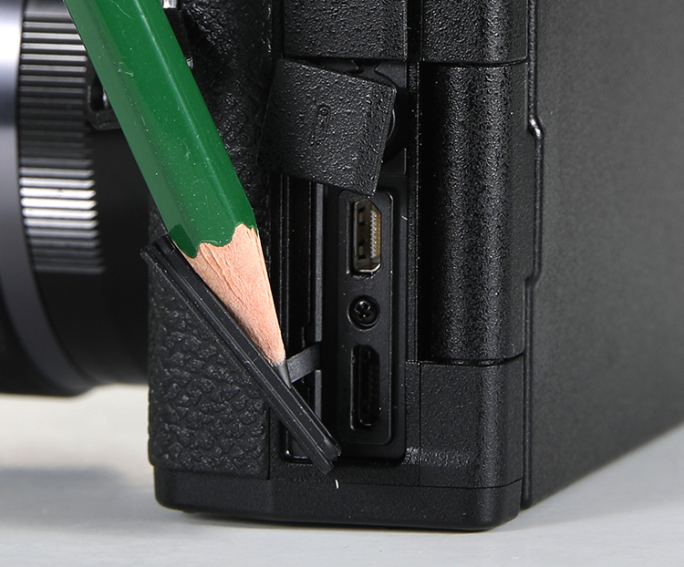 Für den Kontakt zur Außenwelt gibt es auf der linken Schmalseite eine HDMI Typ D- und eine USB 2.0-Buchse (3.0 wäre für eine Kamera dieser Generation aber schon die bessere Wahl). Zwei weitere Buchsen auf der linken Schmalseite nehmen das Mikrofon- bzw. das Fernauslöserkabel auf.