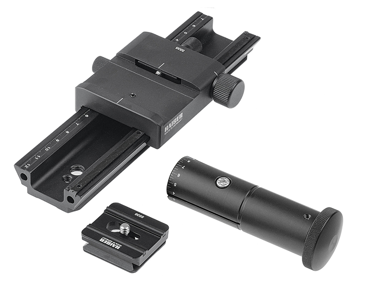 Bei Makroaufnahmen kommt es auf exakte Einstellungen an. Mit dem Makro-Einstellschlitten kann man die Entfernung problemlos auf den Millimeter genau festlegen, indem man den Läufer verschiebt. Das geht mit dem langen Feinjustage-Griff besonders feinfühlig. Der Läufer ist für die Aufnahme der Kamera mit einer Arca-Swiss-kompatiblen Schnellkupplung ausgestattet. Die Schiene ist 200 mm lang und mit einer Arca-Swiss-kompatiblen Schwalbenschwanzführung und je drei 1/4“- und 3/8“-Gewinden versehen, um sie in der richtigen Position auf einen Stativkopf setzen zu können.