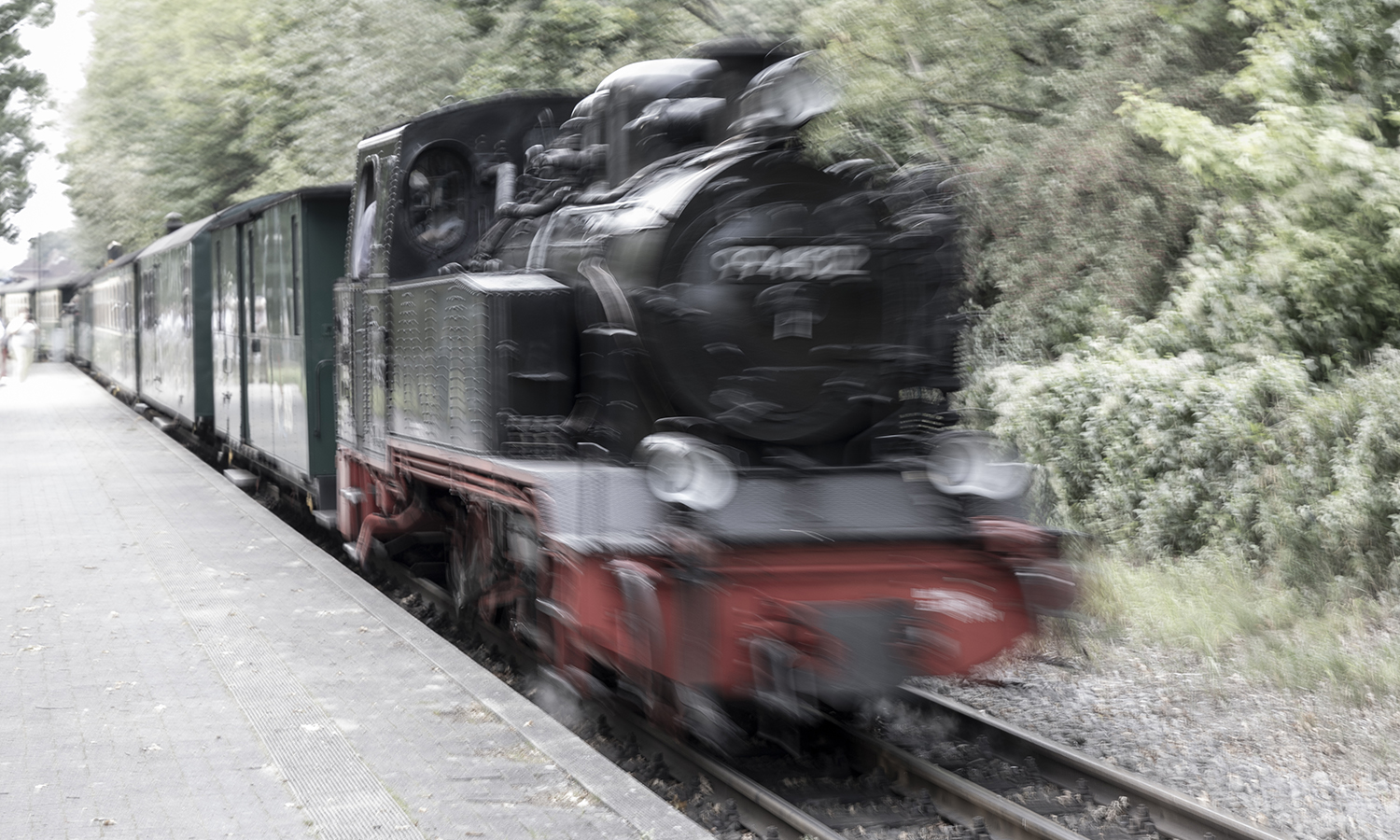 Am Bahnhof – nur noch ein Bahnsteig, aus dem alten Bahnhofsgebäude mit Stellwerk wurden Ferienwohnungen – suchen wir Plätze, um den einfahrenden Zug ins Bild setzen zu können. Dann heißt es warten, bis sich der Rasende Roland schnaubend und stampfend ankündigt und schließlich um die Ecke kommt.
