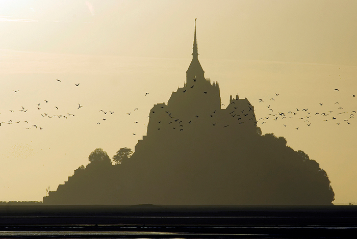 Mont-Saint-Michel im zarten Gegenlicht mit einem Schwarm vorbeiziehender Vögel davor. Könnte ein Composing sein, was aber völlig legitim wäre … es sieht großartig aus.