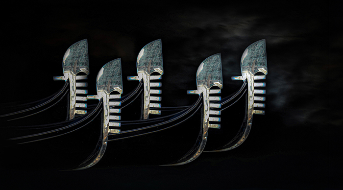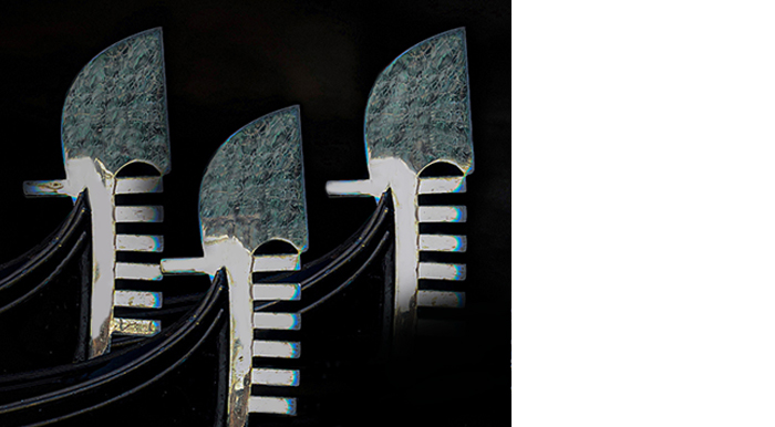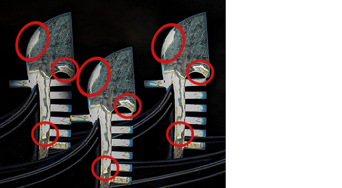 Der Autor hat hier ein Stück Gondel bearbeitet und das Stück fünf mal in sein Format gesetzt. Was dabei sofort auffällt ist, dass alle 5 Gondeln absolut identisch sind, also alle dieselben Fehler in Lack und Holz (?) haben. Ich zeige hier nur mal 3 von 5 Gondeln, damit man besser sieht, was ich meine. Alle haben dieselbe Fehler, immer an derselben Stelle und das registriert das menschliche Auge von ganz alleine, man braucht also nicht mal danach zu suchen..