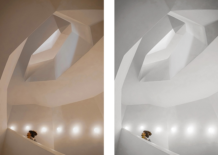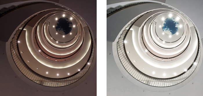 Auch bei meinem zweiten Beispiel ist das nicht anders. Das Foto hat einen so kräftigen Kunstlicht-Stich und ist so dunkel, dass man zweimal hinsehen muss, um zu entdecken, dass es ja oben rechts im Bild einen Durchblick auf den blauen Himmel zu sehen gibt. Dieses Bild hat unterschiedliche Lichttemperatur-Bereiche, daher habe ich hier den Kunstlicht-Charakter per RAW-Filter (in Photoshop kann man den RAW-Konverter auch als Filter anwenden) herausgedreht. Zusätzlich habe ich das Foto noch kräftig per Gradationskurve aufgehellt.