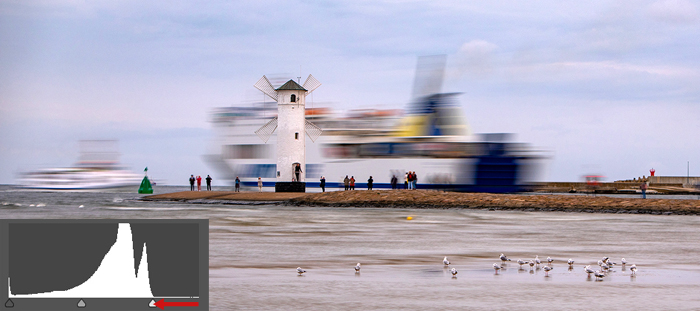 Der Blick aufs Histogramm zeigt ganz deutlich: hier wurde ca. 1/4 des zur Verfügung stehenden Tonwertbereichs verschenkt, der Lichterbereich fehlt also fast vollständig. Mit einer Korrektur des Weißpunktes sieht das dann schon ganz anders aus.
