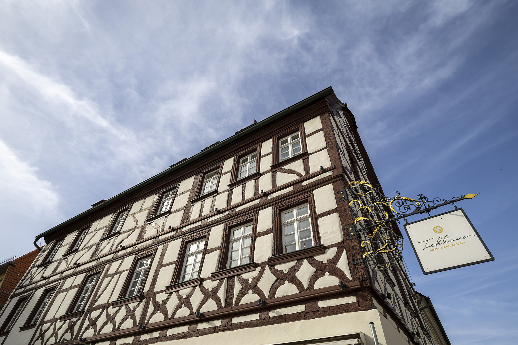 Das Fachwerkhaus steht beim Rathaus von Volkach, einer besuchenswerten kleinen Stadt an der Mainschleife im Maindreieck. Die Mainschleife ist die größte Flussmäanderlandschaft in Bayern. Alle Praxisbilder entstanden bei einem Bummel durch den historischen Stadtkern.