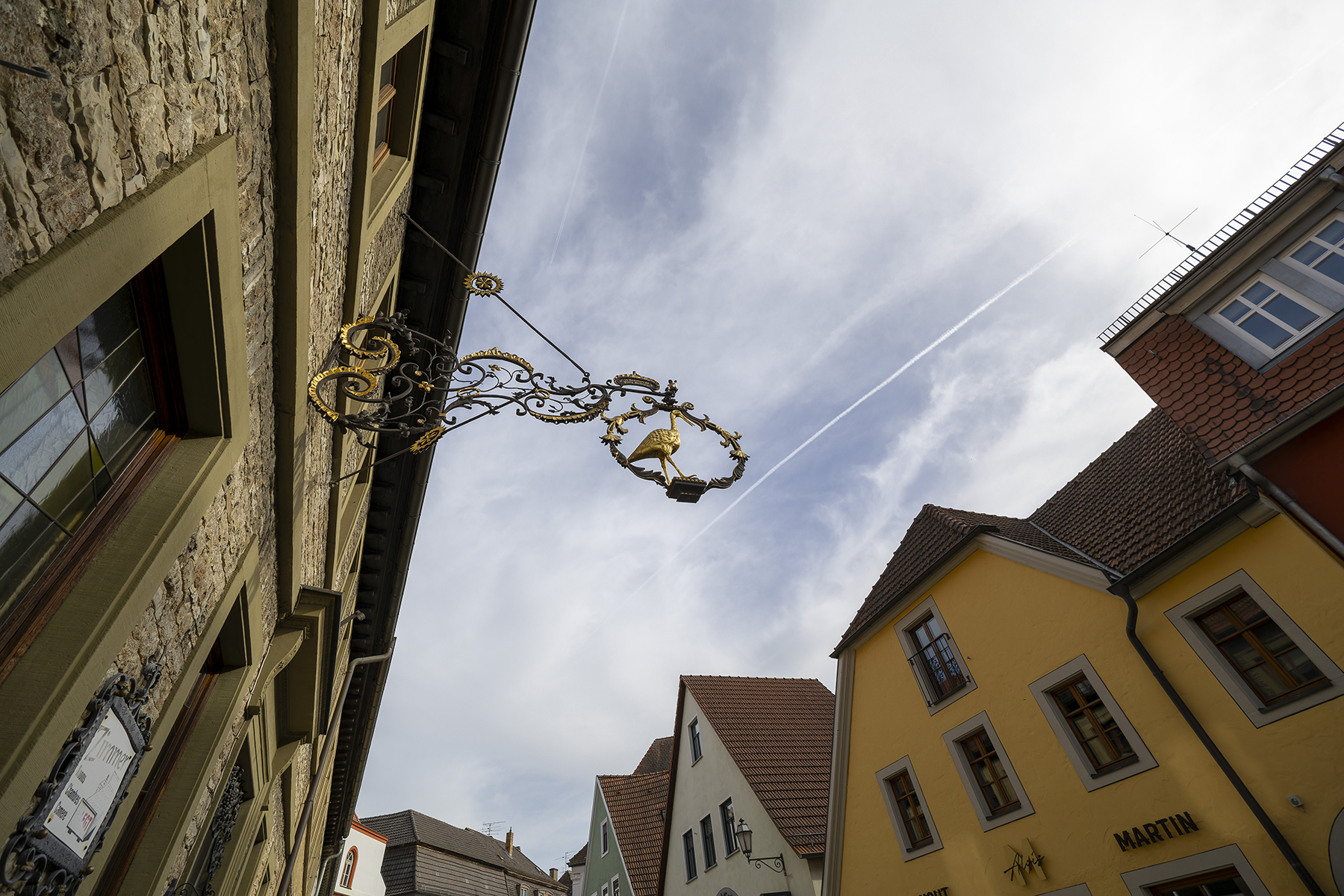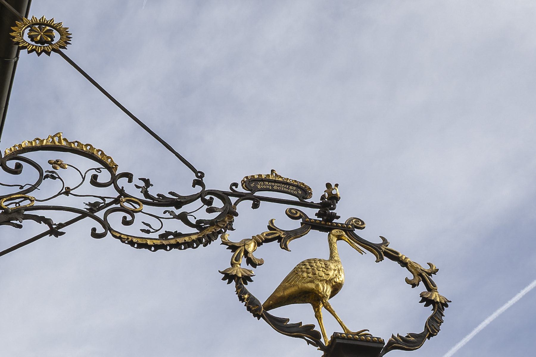 Ein schönes Beispiel für ein „Nasenschild“, das in diesem Fall auf einen Gasthof aufmerksam machen soll. (Nasenschild, weil es wie die Nase aus dem Gesicht aus den Hauswand ragt). Die Pluskorrektur war nötig, um den Storch (ich hoffe, ich liege damit richtig) besser durchzuzeichnen.