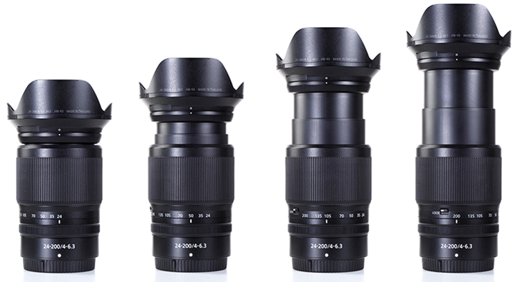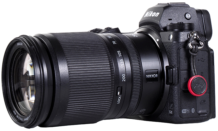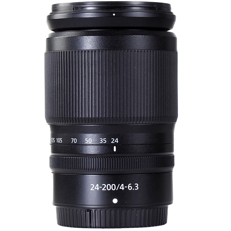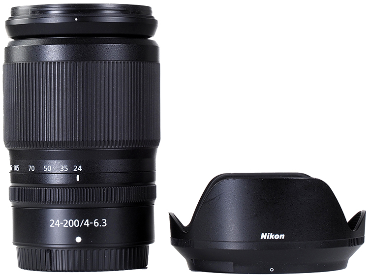Das Z 24-200 mm 1:4-6,3 ist nicht unbedingt zierlich. Es ist bei 24 mm Brennweite 155 mm lang und wächst bis 200 mm Brennweite auf 217 mm – aber das ist kein Problem, da die schweren Linsengruppen hinten im Objektiv sind und sich beim Zoomen das Gleichgewicht so gut wie nicht ändert. Die Längen gelten mit aufgesetzter 4-Segment-Streulichtblende! Sie wird mitgeliefert, was einen Daumen hoch wert ist, und lässt sich zum Transport umgedreht ins Bajonett drehen.