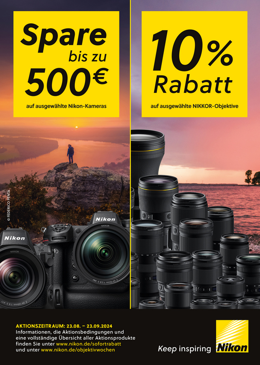 Nikon Deutschland startet gleich zwei neue Rabatt-Aktionen, mit denen beim Kauf von Kameras und beim Kauf von Objektiven gespart werden kann.