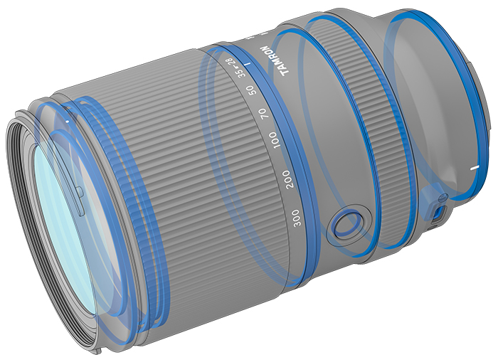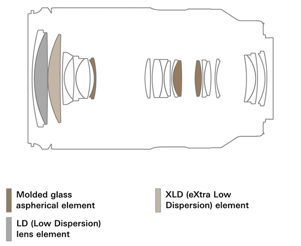 Das Innenleben besteht aus 20 Elementen in 13 Gruppen. Darunter sind ein XLD-Linsenelement (eXtra Low Dispersion) und ein LD-Linsenelement (Low Dispersion), die eine effiziente Kontrolle von Aberrationen (inkl. chromatischern Aberration) möglich machen sollen.