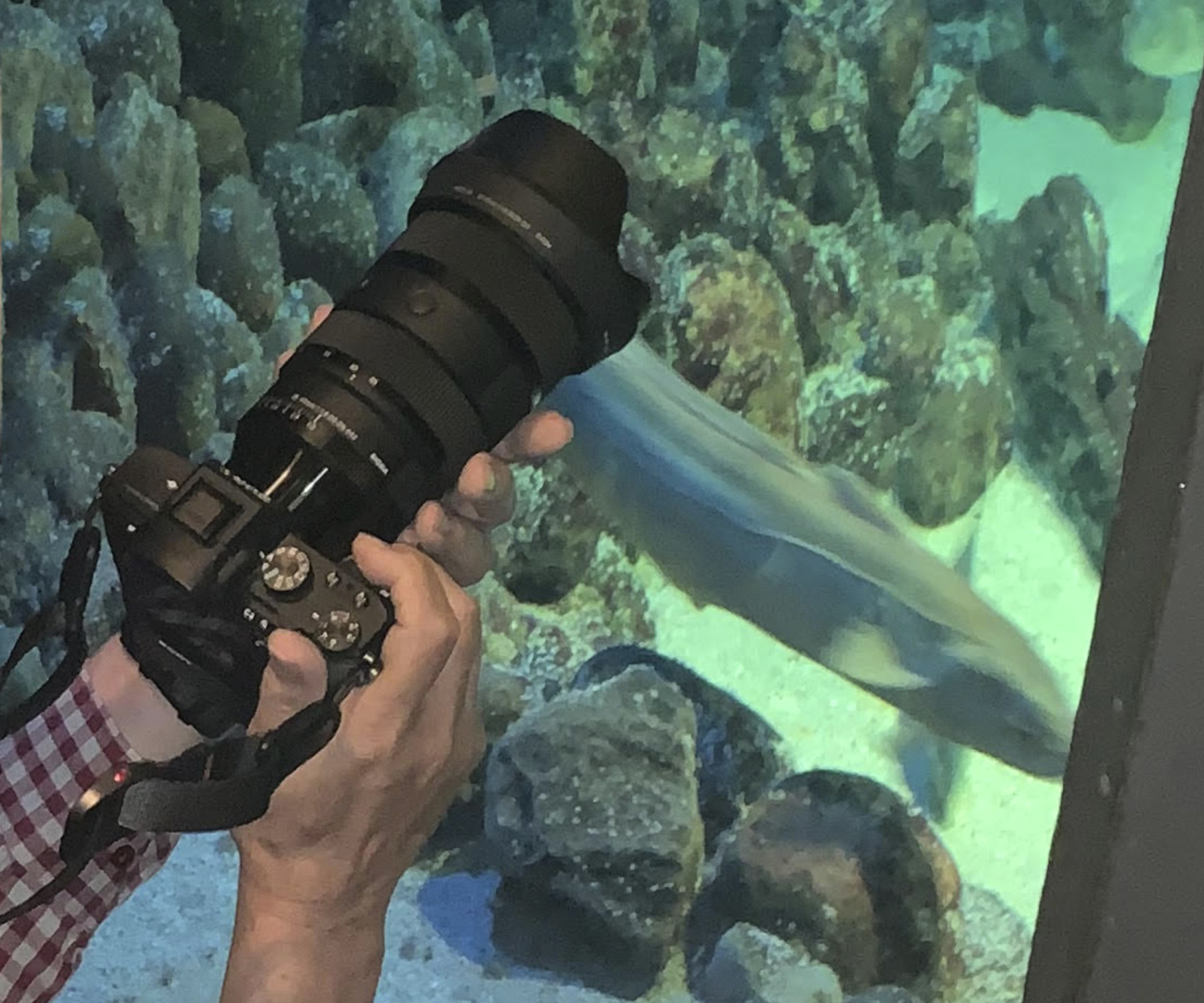 … und nah ran an die Scheibe, um Reflexe durch Leuchten im Raum aus dem Bildfeld zu schubsen. Der Autofokus spielt trotz der schwierigen Verhältnisse mit. (Tipp an die Entwickler: Künftig auch eine „Fisch-Erkennung“ einführen … 🙂 )