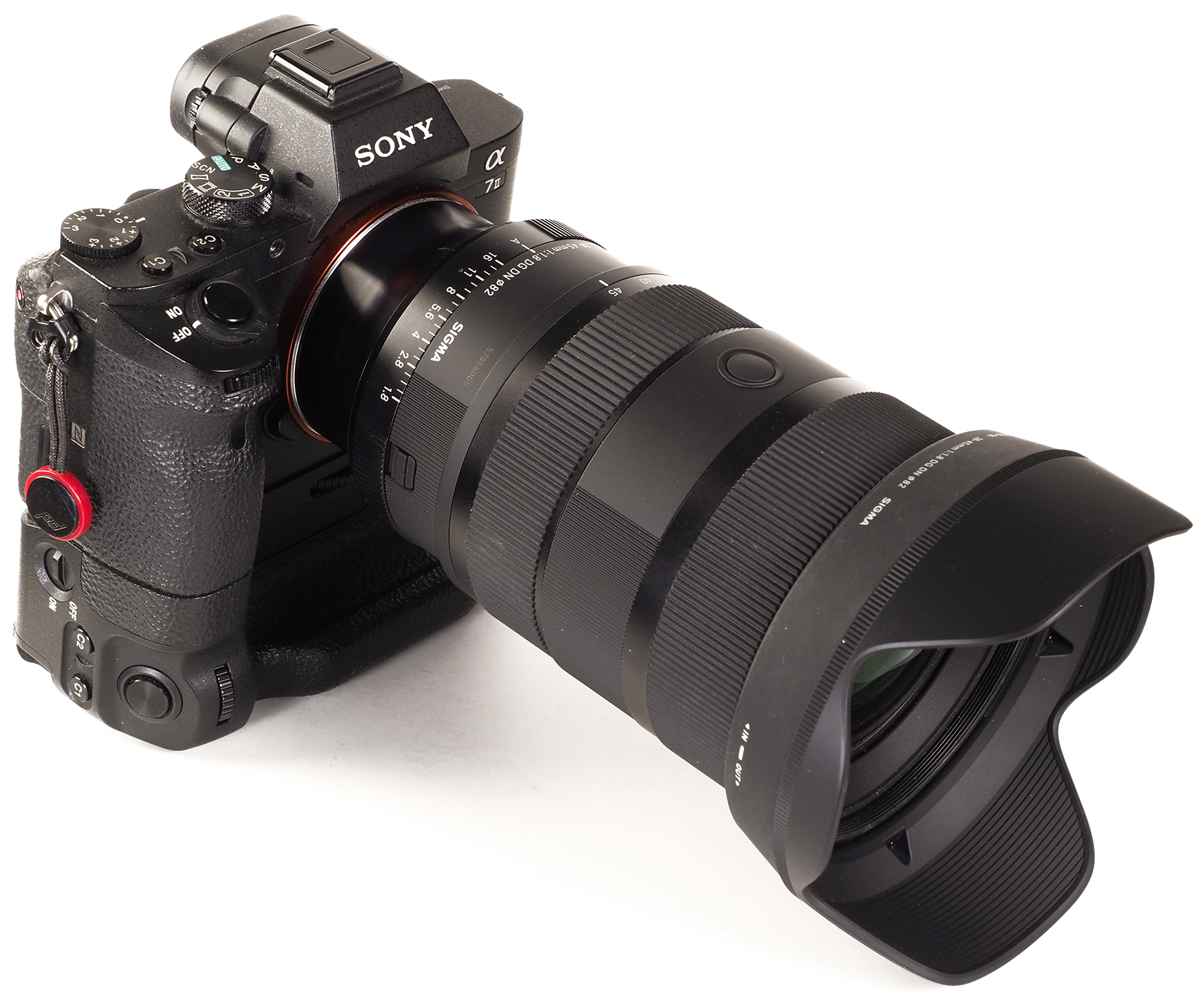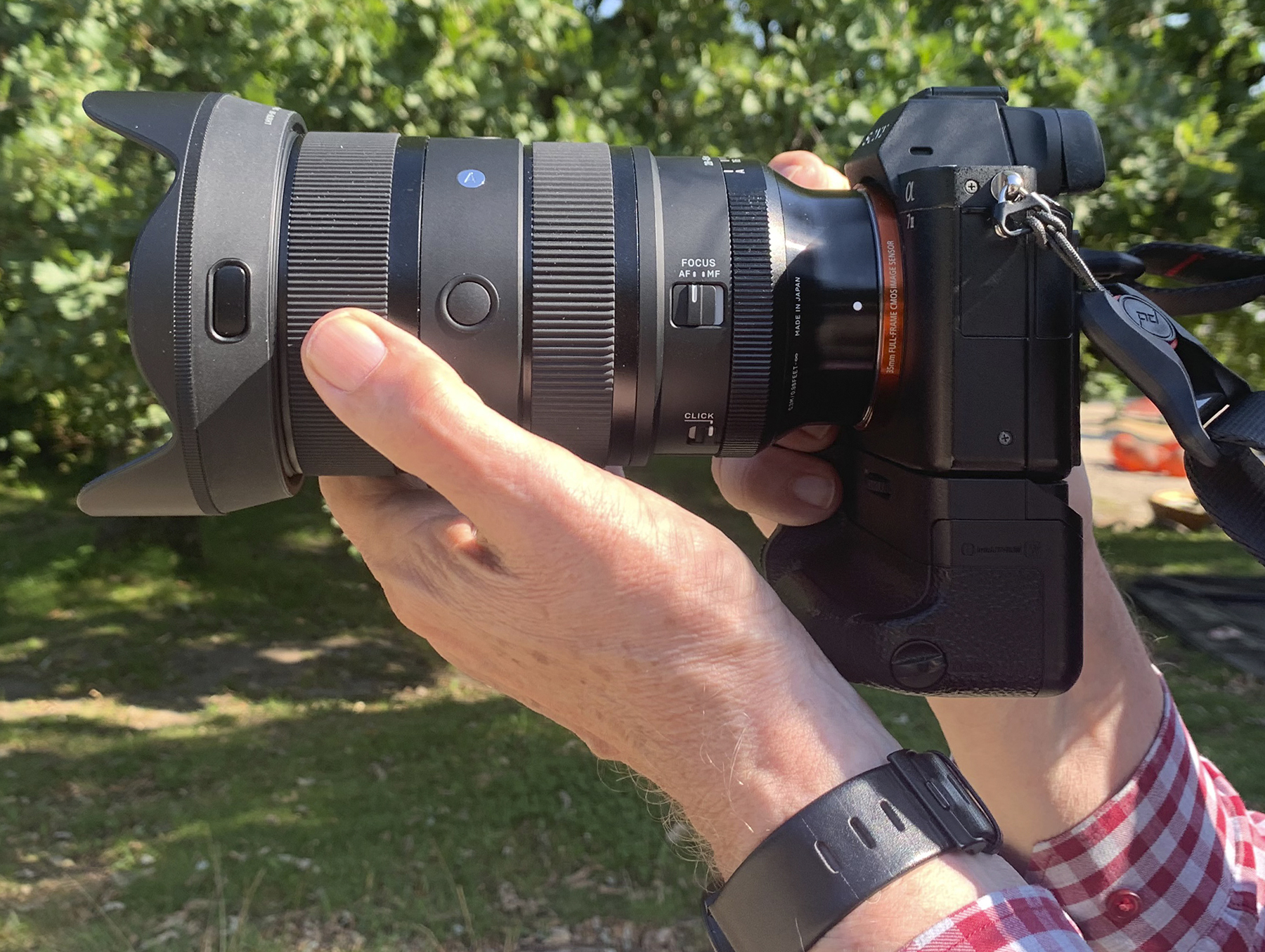 Die Werte gelten für das Objektiv mit E-Mount, das ich an meiner guten alten Sony A7 II mit Batteriegriff eingesetzt habe – eine Kombi, die gut in der Hand liegt. (Die Variante mit L-Mount ist 2 mm kürzer und 10 g schwerer).