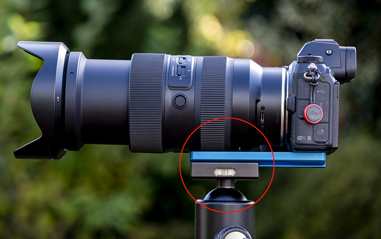 … wie hier beispielsweise beim lichtstarken Tamron 35-150 mm F2-2.8 DiIII VXD an einer Nikon Z6 II. Die Kupplungsplatte drückt das Zoom ein bisschen nach oben und – schlimmer noch – blockiert den Zoomring, der bei diesem Fall hinten angeordnet ist.