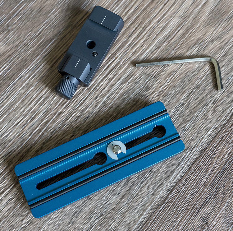 Sie besteht aus einer 150 mm langen Kupplungsplatte mit Arca-Swiss-kompatiblem Fuß und einer zierlichen Q=Mount Mini Schnellkupplung, die man längs oder quer aufsetzen kann. Das Gewicht von 150 g fällt in der Fototasche oder im Rucksack praktisch nicht auf.