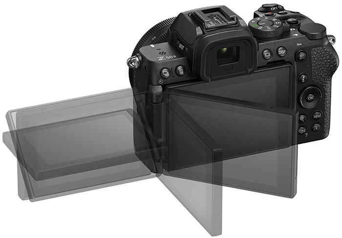 Der Rückwandmonitor hat zwar dieselbe Größe und Auflösung wie der Z50 (3,2“, 1,04 Mio. RGB-Dots) – aber während er der Z50 nur horizontal geschwenkt werden konnte, kann er bei der Z50II zur Seite geschwenkt und gedreht werden.