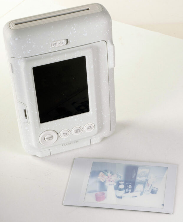 In der Redaktion: Die Instax mini LiPlay in der Farbe „Misty White“. Zur Wahl stehen noch „Matcha Green“ und „Deep Bronze“ – dass es nichts in Richtung „Light Pink“ oder „Azur Ocean“ gibt, ist schade (finden zumindest meine Enkeltöchter und ihre Cousine).