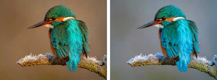 Schon auf den ersten Blick fällt einem der Kunstlicht-Charakter auf, egal ob er tatsächlich durch Kunstlicht im Zoo oder durch warmes Licht in der Natur entstanden ist. Der Juror weiß ja nicht, unter welchen Umständen das Foto geschossen wurde, sieht den Farbstich automatisch als Fehler an und/oder empfindet ihn als unangenehm. Besonders deutlich wird das, wenn man sich per Pipette eine Farbe des Gefieders herauspickt und sich fragt, ob dies wirklich das metallische Blau eines Eisvogels ist. Füllt man eine kleine Fläche mit der aufgenommenen Farbe erhält man dieses undefinierbare grau-grün.