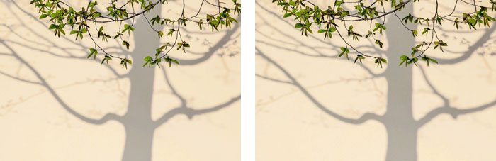 Dazu noch ein schnelles Beispiel: der Schatten des Baumes im Foto links steht deutlich schief. Das ist ja eigentlich kein Drama, aber auch hier empfindet das Auge den Schiefstand sofort als störend und das Foto ist „raus“. Zerrt man das Bild gerade, ist die optische Störung verschwunden (rechts im Bild) und die Chance auf einen oder mehr Punkte für die Wertung steigen. Dass der Baum dabei etwas gezerrt wird und sich dadurch natürlich der Bildausschnitt leicht ändert ist völlig wurscht, der Juror weiß das ja nicht. Die Zerrung bringt sogar zusätzlich noch einen kleinen Pluspunkt mit sich: der Schatten des Stammes rückt weiter aus der Bildmitte in Richtung der rechten Drittellinie und die Bildgeometrie gewinnt dadurch noch.