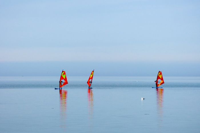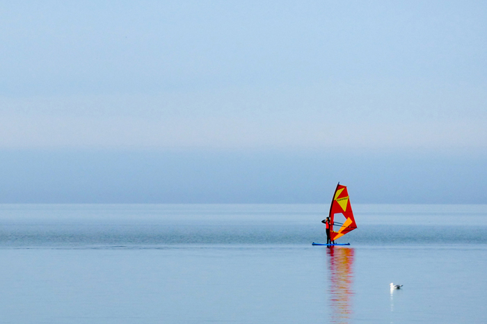 In meinem ersten Beispiel tummeln sich zu viele Surfer zu weit voneinander entfernt im Bild, das Auge des Jurors weiß also gar nicht, wo es denn nun eigentlich hinwandern soll. Dazu kommt, dass der Horizont hier in der Vertikale zu mittig liegt. Ich habe bei meiner Version die beiden Surfer links rausgenommen, die Vögel etwas versetzt und das Bild unter Beibehaltung des Seitenverhältnisses wesentlich enger geschnitten. Dadurch kommt bei mir auch der Horizont weiter aus der vertikalen Mitte. Man kann jetzt darüber streiten, ob man das Bild noch spiegelt … ich habe es probiert und mir gefällt diese Version, bei der der Surfer von rechts nach links ins Bild fährt tatsächlich besser.