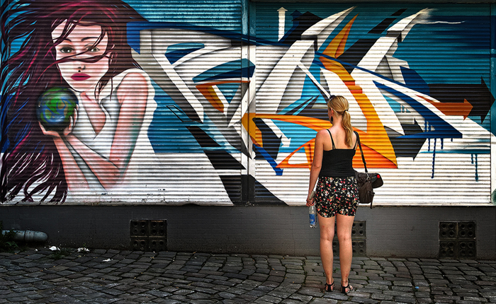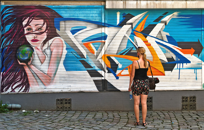 Ganz ähnlich habe ich es in meinem zweiten Beispiel zu diesem Thema gemacht: ich habe die gemalte Frau links und die reale Frau rechts in ihrer Helligkeit belassen und alles, was eher unwichtig ist, etwas abgedunkelt. Zusätzlich habe ich das Bild noch etwas begradigt und das störende Stück Beton oben rechts weggeschnitten. Die Veränderungen sind minimal, aber genau das macht in der Bewertung manchmal einen großen Unterschied.