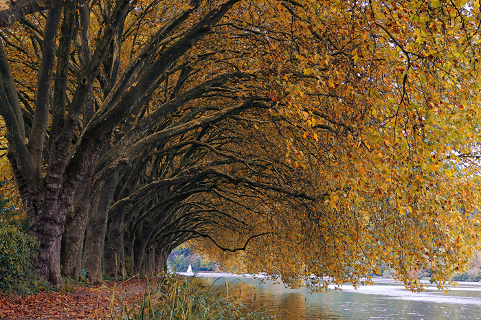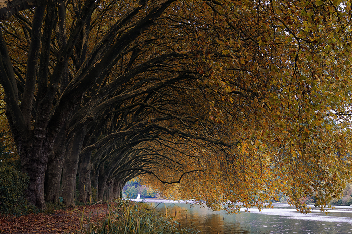 Im ersten Beispiel habe ich lediglich eine leichte Vignette eingebaut. Ich habe zuerst eine Einstellungsebene vom Typ „Schwarzweiss“ über die Hintergrundebene gesetzt und dann deren Modus auf „multiplizieren“ und die Deckkraft auf 70% gestellt. In einer Ebenenmaske habe ich dann mit schwarzer Farbe leicht oval die Korrektur im Bereich des Segelbootes und des Tunnels aus Ästen wieder weich herausgemalt, so dass diese Bereiche dann durch ihre Helligkeit deutlicher nach vorne kommen.