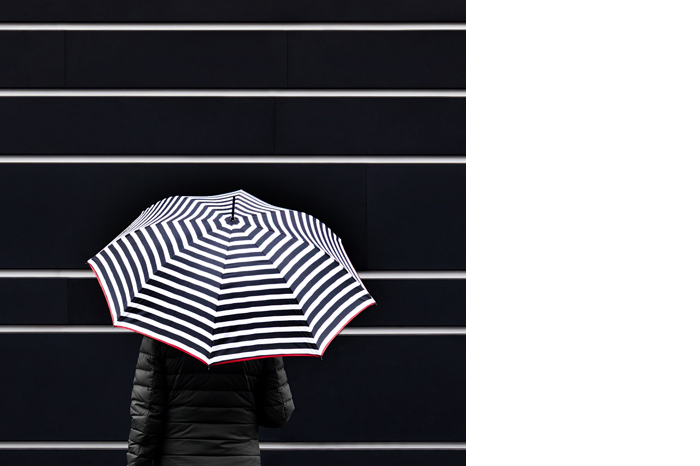 Ich habe es alternativ mal quadratisch und zentriert probiert und es funktioniert meiner Meinung nach nicht schlechter … aber auch nicht unbedingt besser. Und auch hier kann man jetzt weiter diskutieren: setzt man den Schirm mittig oder die Person, die den Schirm trägt? In diesem Fall wirkt für meinen Geschmack der mittige Schirm besser als die mittig platzierte Person.