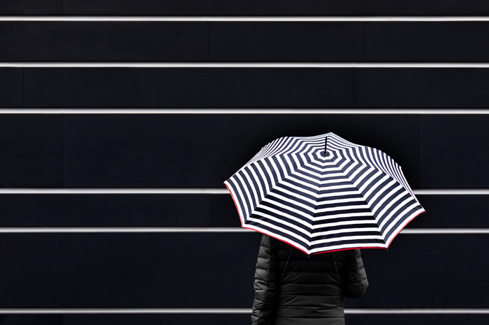 Karin hat auch für die vierte Wettbewerbsrunde ein (wie oben schon beschriebenes) aufgeräumtes und klares Foto eingereicht und von mir die verdiente Menge an Punkten bekommen. Man muss ihr nicht erklären, dass bei einer nicht perspektivischen Aufnahme die Linien, die durch das Bild laufen, gerade sein müssen. Das macht sie ganz automatisch und genau das zeichnet eine gute Wettbewerbsfotografin/einen guten Wettbewerbsfotografen aus. Karin hat die Person mit dem Schirm innerhalb Ihres Formates rechts auf 2/3 positioniert. Was hier die beste Wahl ist kann man beim besten Willen nicht sagen, das wird immer eine Sache des Geschmacks bleiben.