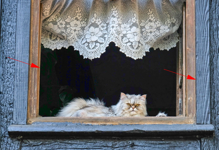 Im nächsten Beispiel sind die horizontalen Linien komplett gerade, aber die vertikalen leider nicht ganz. Auch, wenn der Fensterrahmen hier nur ganz leicht schief ist, so sind dadurch jegliche Chancen auf eine hohe Punktezahl im Eimer. Durch die Verzerrung wird oben links in der Ecke auch noch ein Detail sichtbar, das die Bildwirkung zusätzlich stört.