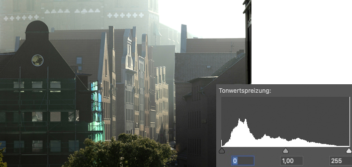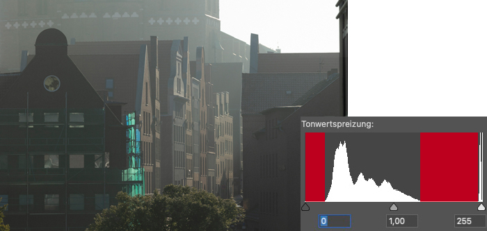Sehr häufig werden Beiträge eingereicht, bei denen man schon auf den ersten Blick sieht, dass das eigentlich zur Verfügung stehende Tonwertspektrum nicht annähernd ausgenutzt wurde. Auch bei dem Bild unten sieht man spätestens am Histogramm, dass im Tiefenbereich ein Loch ist und dass auch der Vierteltonbereich komplett ohne Zeichnung ist. Die wenigen Ausschläge ganz rechts im Histogramm kommen durch den weißen Fleck rechts oben im Bild. Durch dieses Fehlen von Tonwerten wirkt das Bild sehr flau und flach.