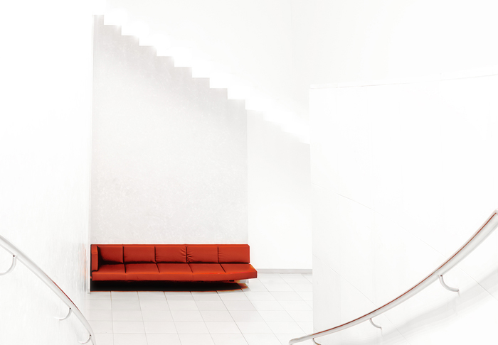 Ganz knapp außerhalb meiner persönlichen Top 6 liegt das folgende Bild. Was hat die Fotografin hier richtig gemacht? Das Bild hat eine brillante Linienführung und die Farbigkeit ist auf den Punkt bearbeitet. Für den Fall dass der Raum nicht mit kaltweißen Leuchtmitteln beleuchtet war, wurde es relativ sicher unter Kunstlicht-Bedingungen aufgenommen. Das bedeutet, dass der Rohschuss vermutlich einen deutlichen Gelb-Stich hatte, wenn der Weißabgleich bei der Aufnahme nicht komplett manuell eingestellt wurde. Zwei von drei Wettbewerbs-Einreichungen hätten diesen Farbstich immer noch, wenn ich das Bild von Herbert zur Jurierung bekomme. Das dritte könnte dieses Foto sein, weil die Autorin die Grundregeln der Wettbewerbsfotografie kennt und den Kunstlicht-Stich als „No-Go“ erkannt und beseitigt hat. Die rechts hochstehende Sofa-Ecke hätte ich persönlich noch runtergebogen und das Sofa damit passend zur Gesamt-Geometrie begradigt, aber das kann man schon unter „Kosmetik“ verbuchen.