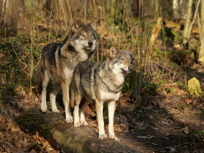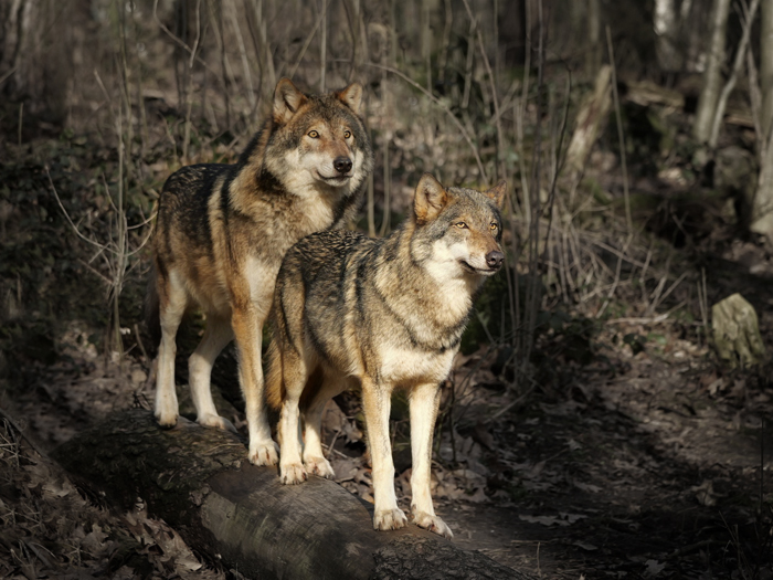 Auch in meinem nächsten Beispiel geht es darum, das eigentliche Hauptmotiv besser vom Umfeld zu trennen. Wölfe und Umfeld liegen im Bild im gleichen Helligkeitsbereich und sind auch noch von der Farbigkeit her so gut wie gleich … der Kontrast zwischen Hauptakteuren und Umgebung ist hier also sehr gering. Daher habe ich bei diesem Beispiel das eher unwichtige Umfeld dunkler und weniger gesättigt korrigiert, wodurch die beiden Wölfe viel besser nach vorne kommen.
