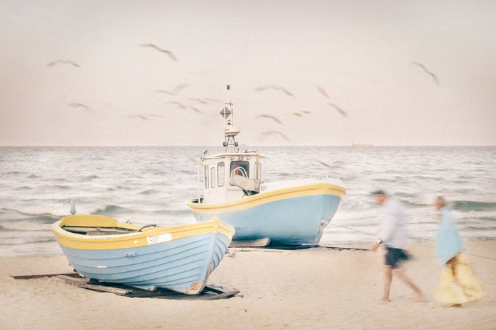 Das sieht beim nächsten Beitrag genau umgekehrt aus,… hier hat Marzena alles richtig gemacht und die Szenerie in einen sommerlichen Polaroid-Look gebracht. Der Himmel ist auch hier nicht kitschig postkartenblau, und die Farbpalette des gesamten Bildes besteht eigentlich nur aus entsättigten Gelb- und nicht weniger blassen Cyan-Tönen. Ich hatte gedacht, dass das Bild ohne die Möwen besser aussehen würde und habe sie mal zum Test rausgenommen … muss aber zugeben, dass das Bild, so wie es ist, doch perfekt passt.