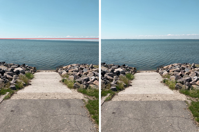 Sobald ein Horizont im Bild sichtbar oder auch nur erahnbar ist, muss er gerade ausgerichtet sein. Bei jedem Wettbewerbsbeitrag sollte man also per Hilfslinie oder per Linealwerkzeug die Ausrichtung des Horizonts zur Sicherheit prüfen. Man kann das besonders leicht übersehen, wenn andere, vermeintlich gerade Linien innerhalb des Bildes in natura schief sind, so wie hier die Kante der Betonfläche. Wenn ich hier den Horizont gerade stelle, muss ich also danach den Vordergrund wieder separat gerade ziehen, sonst wirkt mein Foto „gefühlt schief“. So etwas kommt tatsächlich viel öfter vor, als man denkt.