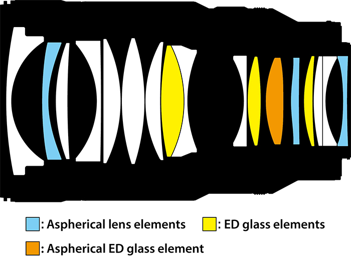 Dafür soll ein Aufbau aus 17 Elementen in 15 Gruppen sorgen. Spezielle ED- und SR-Glas-Linsen sollen der Lichtstreuung entgegenwirken und auch Verzeichnung und weiteren Abbildungsfehlern entgegenwirken.