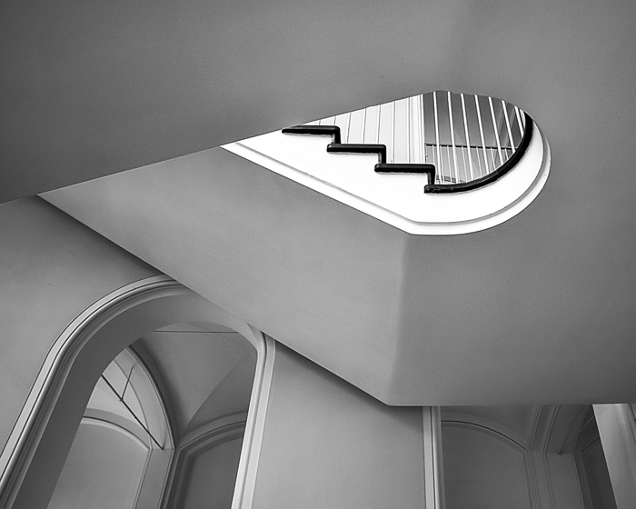 Auch beim nächsten Foto kann man erkennen, wie wichtig ein klarer Bildaufbau und ein „Entschmuddeln“ der Farbigkeit sind. Dieses Treppenhaus hat vermutlich weiße Wände und ein schwarzes Geländer, in dem Fall kann man also die Sättigung auch gleich ganz rausnehmen, um die Farbe zu justieren. So ein Motiv muss man erstmal sehen und dann noch so im Sucher so einrichten (und/oder später beschneiden), dass hinten ein perfekter Wettbewerbsbeitrag rauskommt.