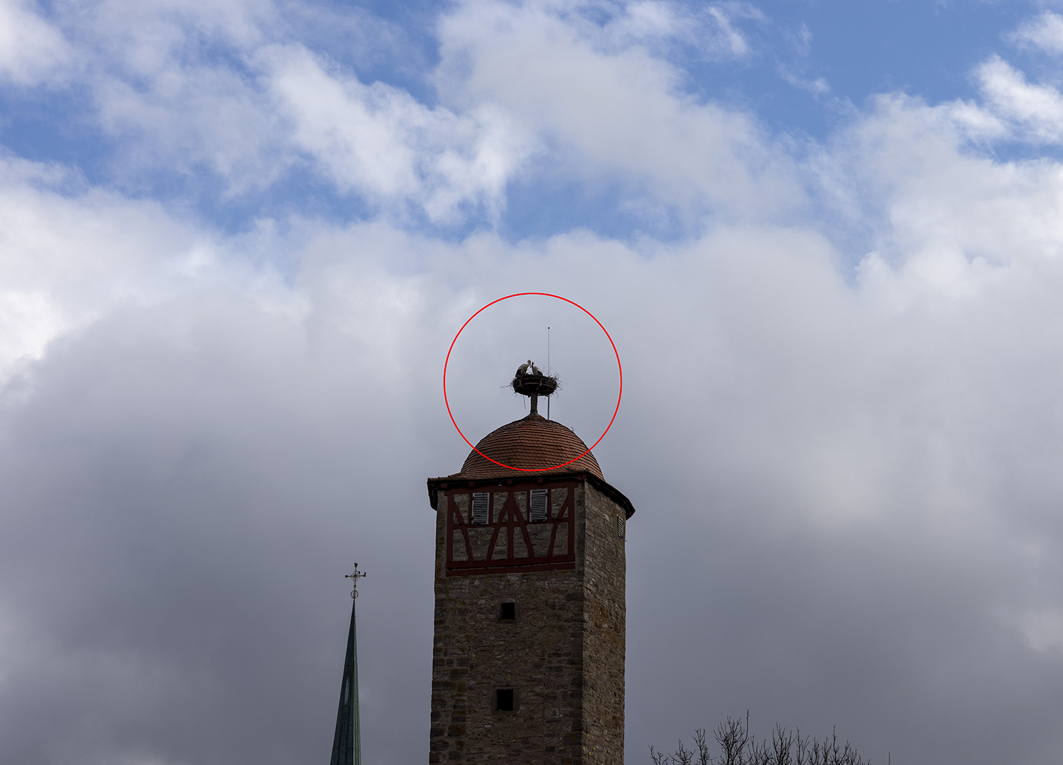 Mit dabei waren die Canon EOS R5 Mark II und das RF 28-70mm F2,8 IS STM als ich sah, dass das Storchennest auf dem Hammelburger Mönchsturm wieder bewohnt wird.