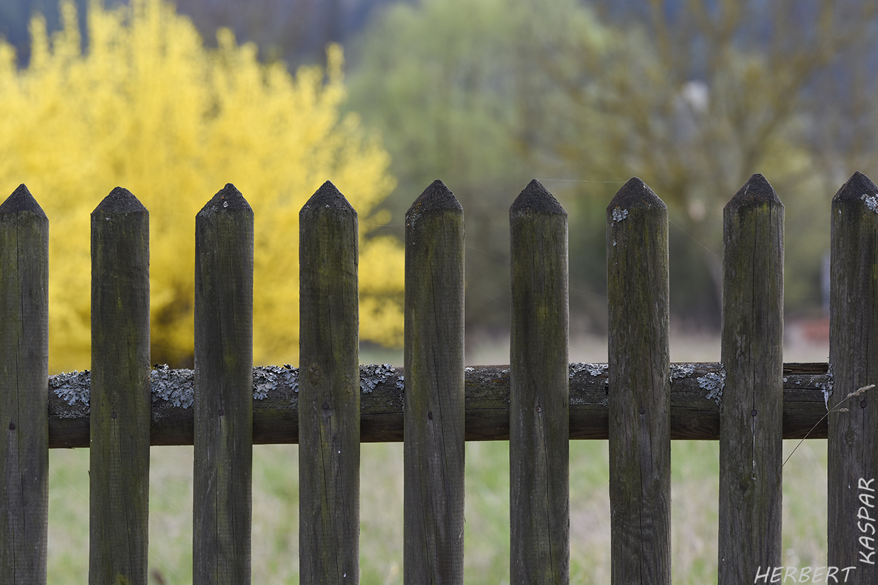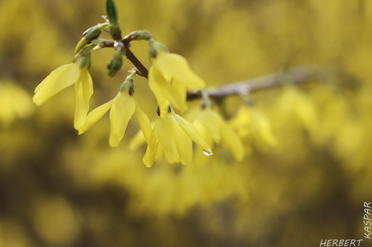 Wenn es beim Spielen mit der selektiven Schärfe einen Punkt gibt, der den Blick einfängt, wie etwa der Wassertropfen im Bild der Forsythie, kann man auch mal wagen, Vorder- und Hintergrund in einer Farbe zu halten.
