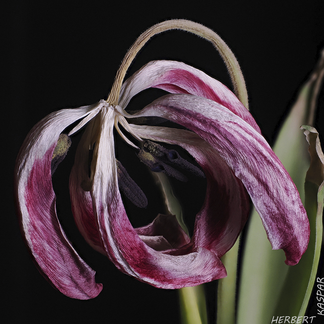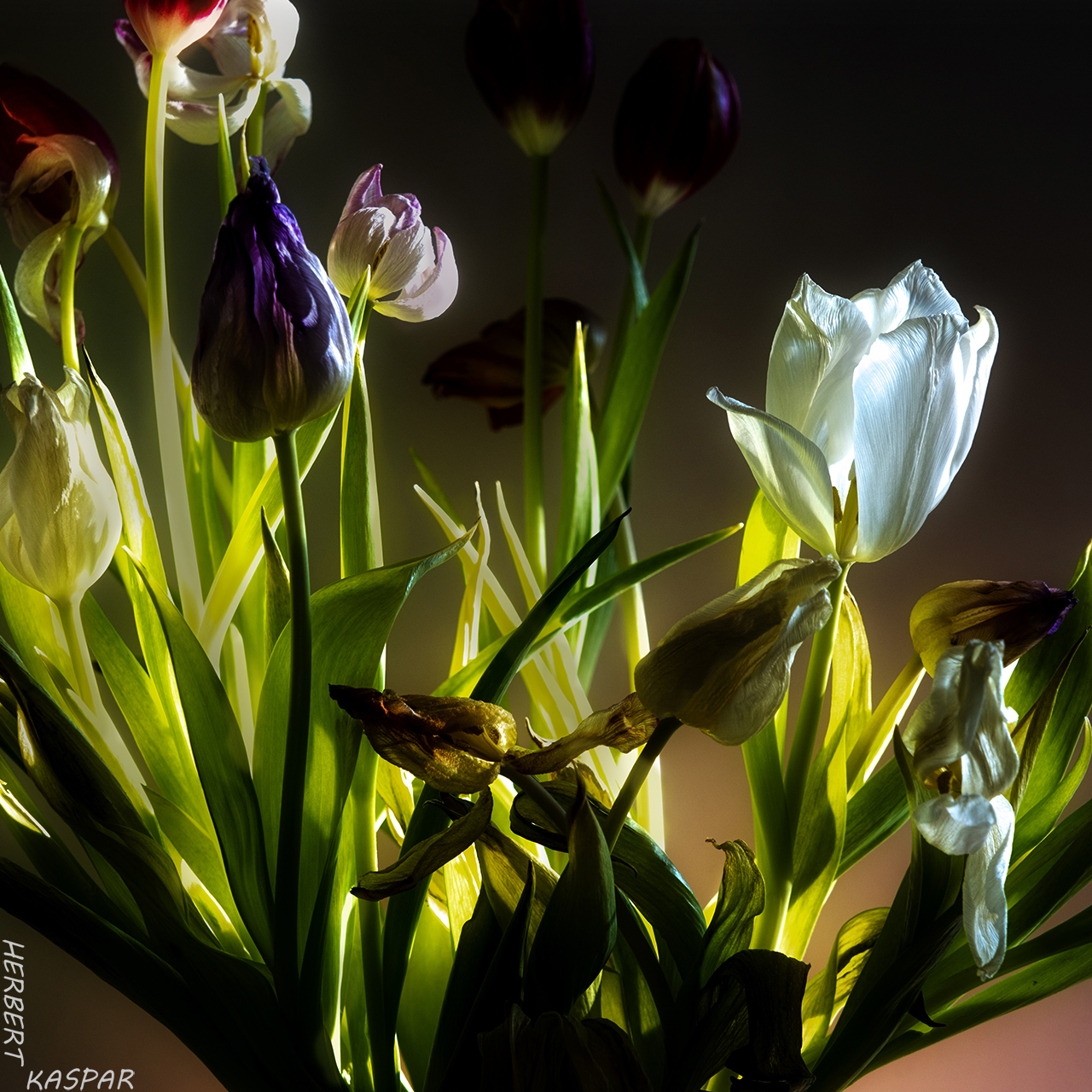 Das gilt nicht nur für frische Tulpen in der Vase. Auch wenn sie schon länger stehen, die Köpfe absinken und wenn sie schließlich trocknen, sind sie faszinierende Motive. Das heißt: die Anschaffung von einem oder zwei Bund Tulpen ist für jeden Hobbyfotografen eine gute Investition, und Geduld hilft dann, dieses eine Motiv in vielen unterschiedlichen Bildern festzuhalten.