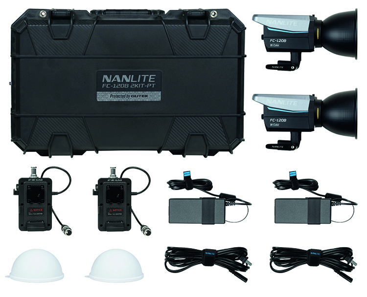 Das Set besteht aus zwei Weißlicht-Scheinwerfern FC-120B Bi-Color, jeweils mit Reflektor, Diffusion Dome, Netzteil und Anschlusskabel sowie 2 Akku-Handgriffen – alles zusammen in einem Schutzkoffer/Trolley Tortoise T-300 mit Inneneinteilung. Die Farbtemperatur der beiden Scheinwerfer, die eine Nennleistung von 145 W haben, lässt sich regeln (2700 K – 6500 K). Durch den Vorsatz eines Diffusions Dome lässt sich eine weiche, natürliche Ausleuchtung erzielen, da das Licht gleichmäßig gestreut wird. Durch die Akku-Handgriffe ist man bei der Arbeit unabhängig vom Stromnetz.