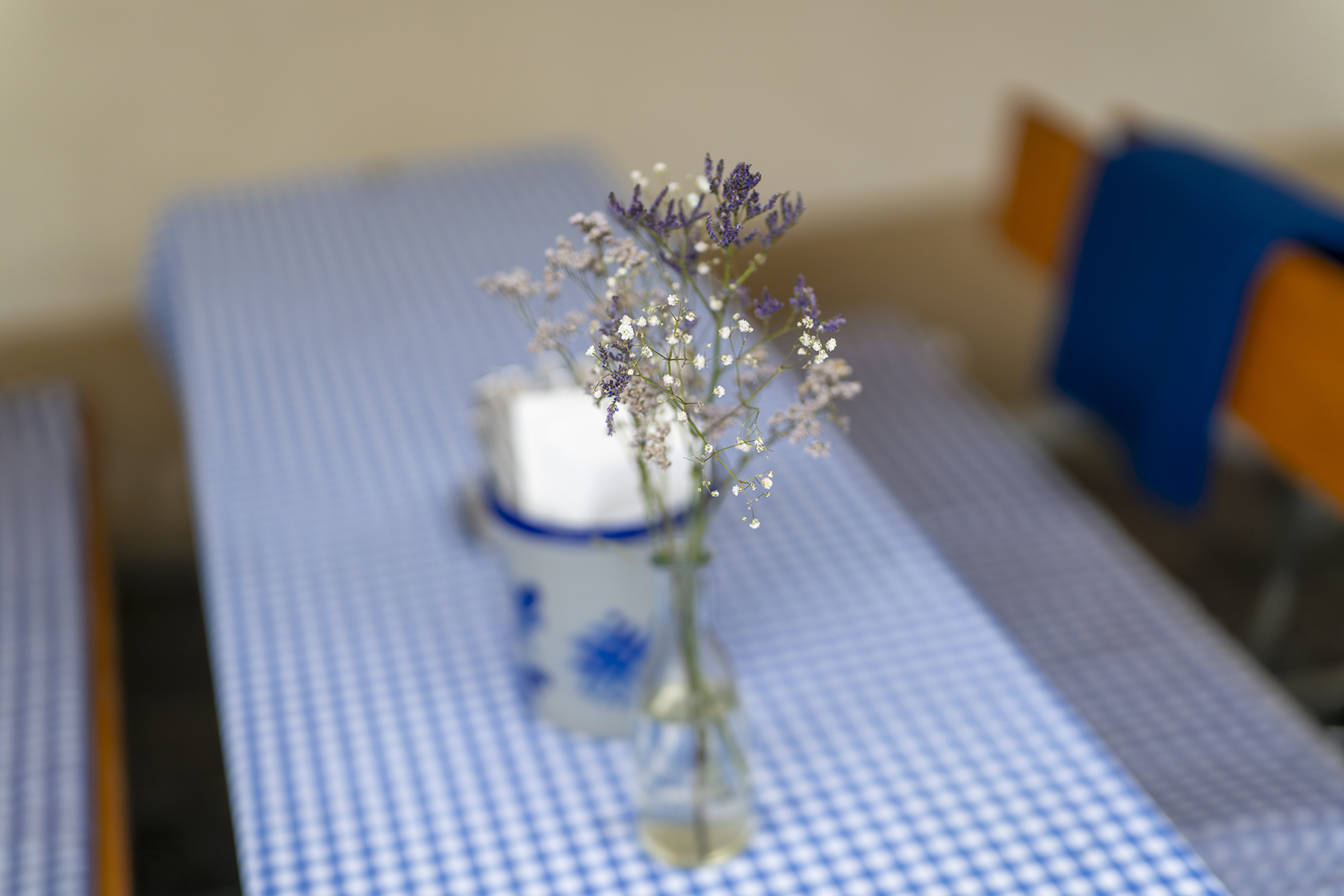 Ob bei etwa 4 °C wirklich jemand draußen essen möchte? Die Tische vor einem Lokal sind auf jeden Fall gedeckt. Der – nun ja: zurückhaltende – Blumenschmuck lässt sich dank ganz offener Blende gut vom Hintergrund trennen.