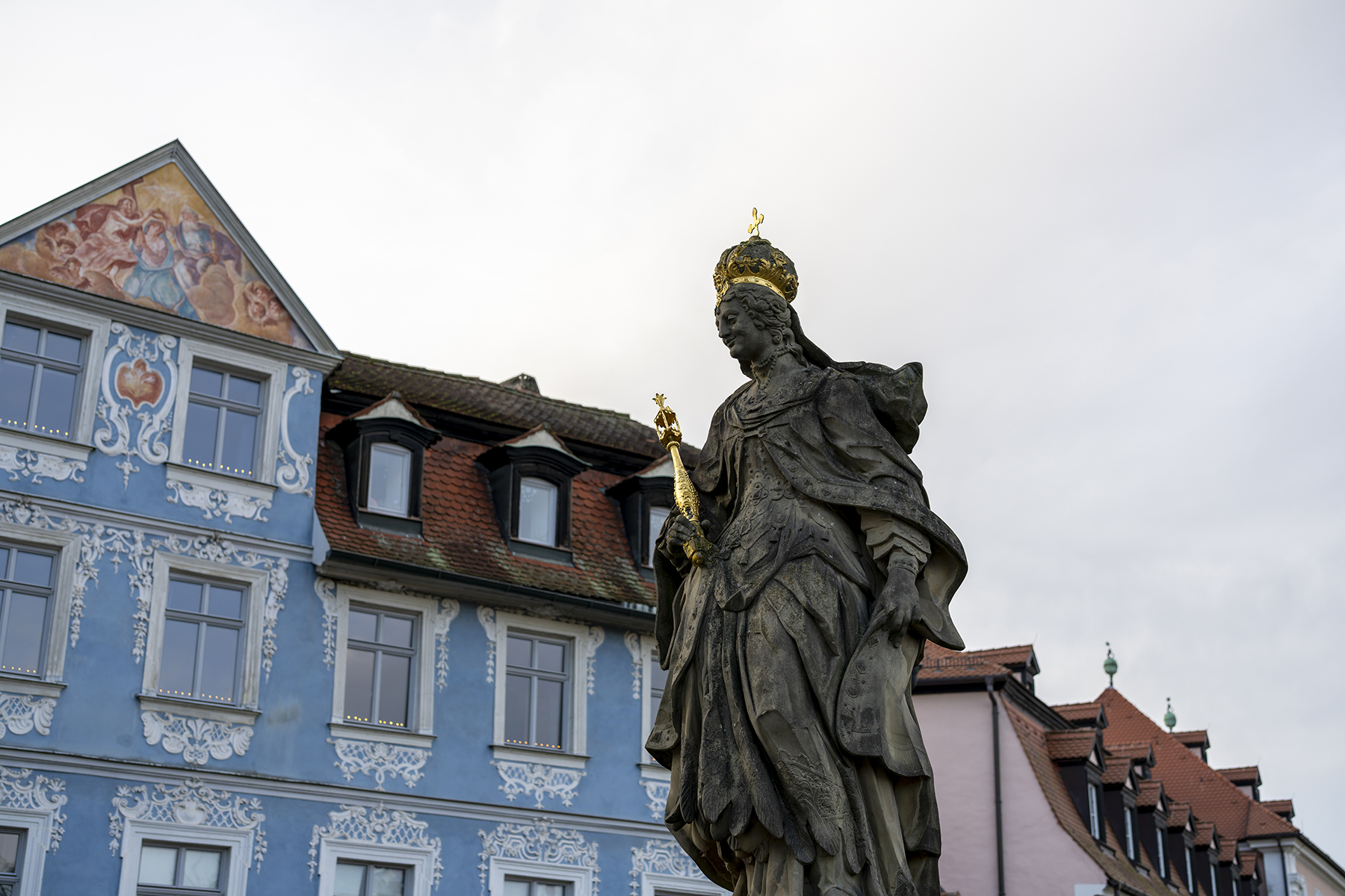 Auf dem weiteren Weg wartet Kaiserin Kunigunde vor dem Hintergrund der hellblauen Barockfassde des Hellerhauses …