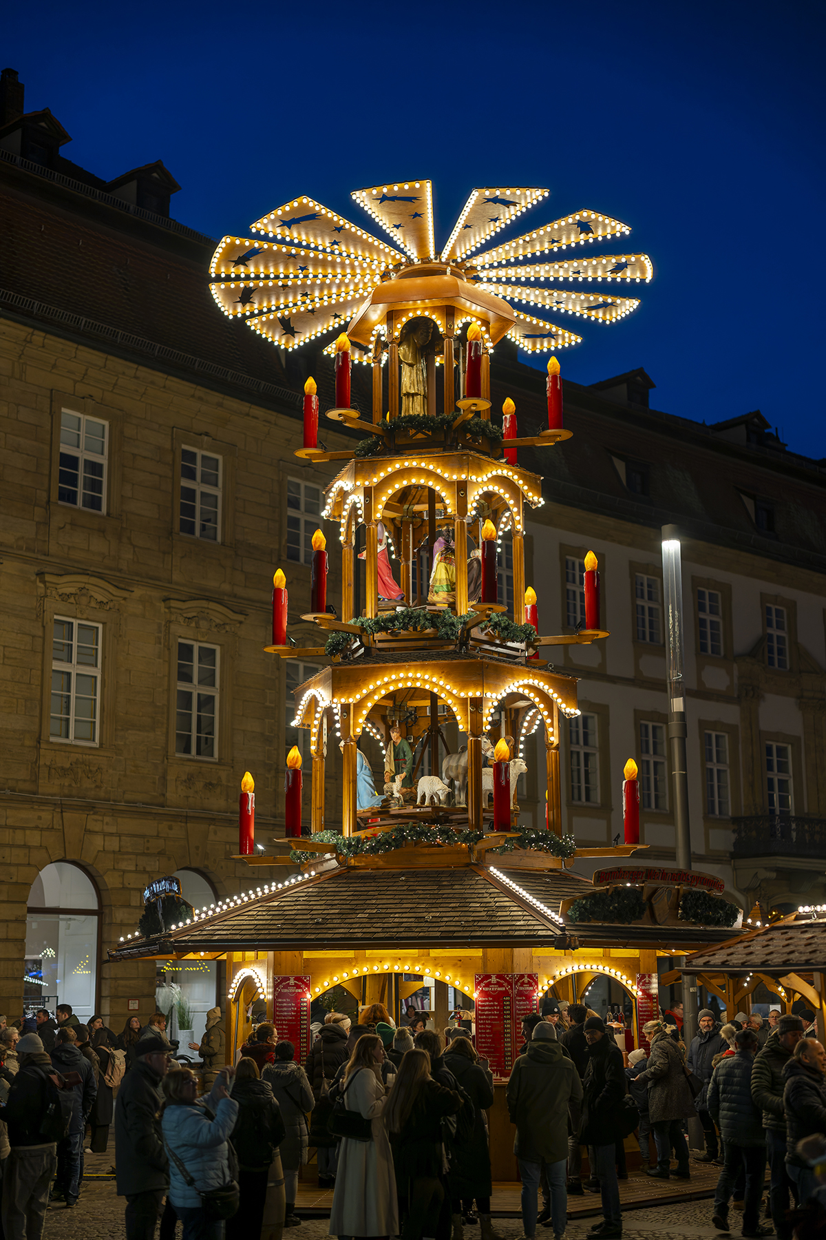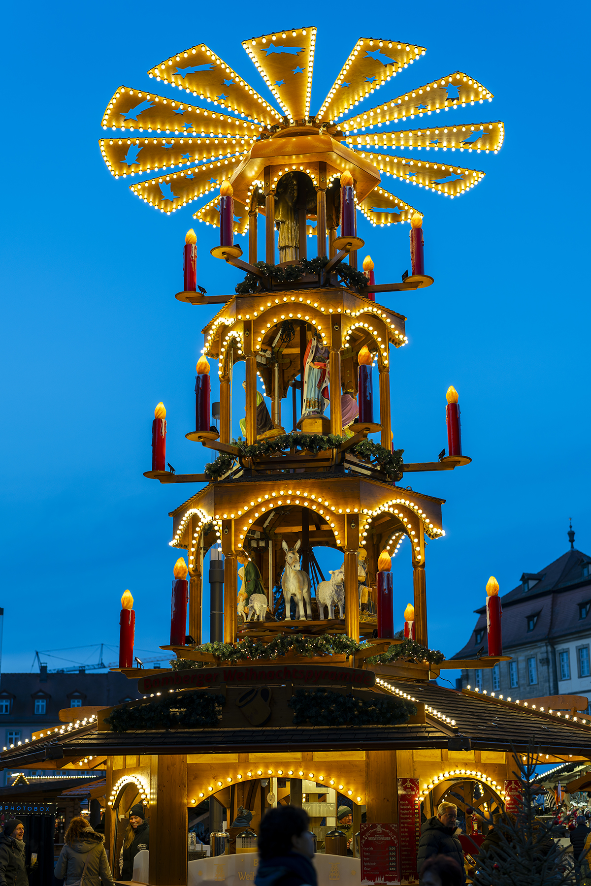 Inzwischen wird es dämmrig, die richtige Zeit für einen Besuch des Weihnachtsmarktes, überragt von der großen Pyramide.