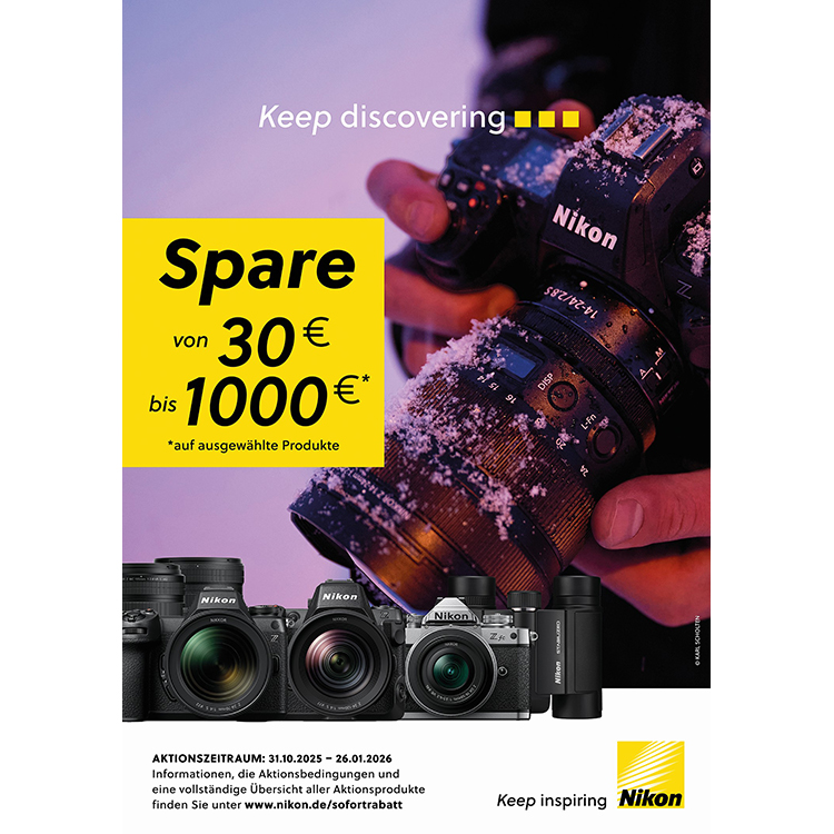 Nur die bei teilnehmenden Händlern erworbenen Produkte, vertrieben durch Nikon Deutschland, sind aktionsberechtigt. Eine nachträgliche Auszahlung des Rabattes ist nicht möglich.