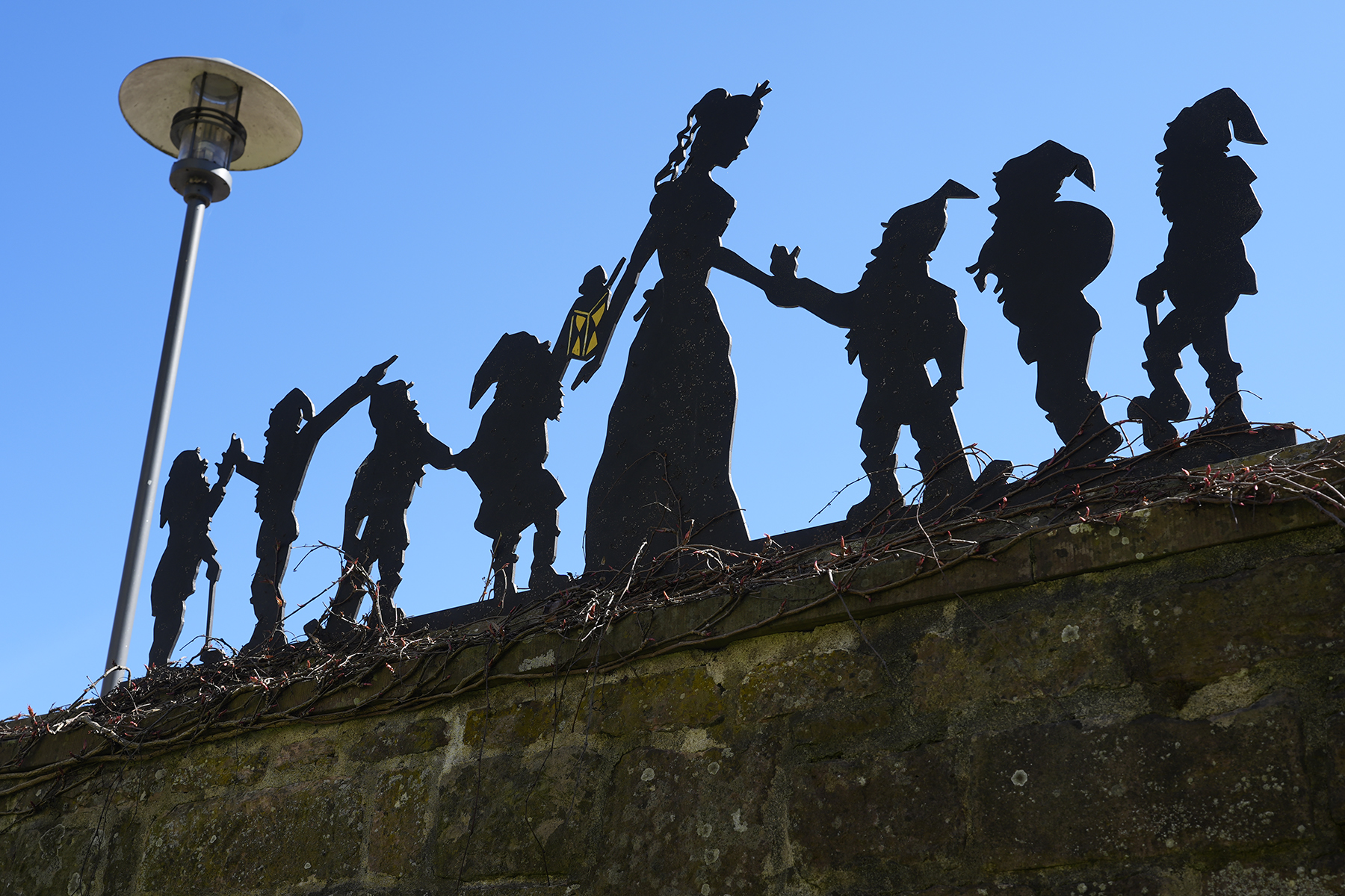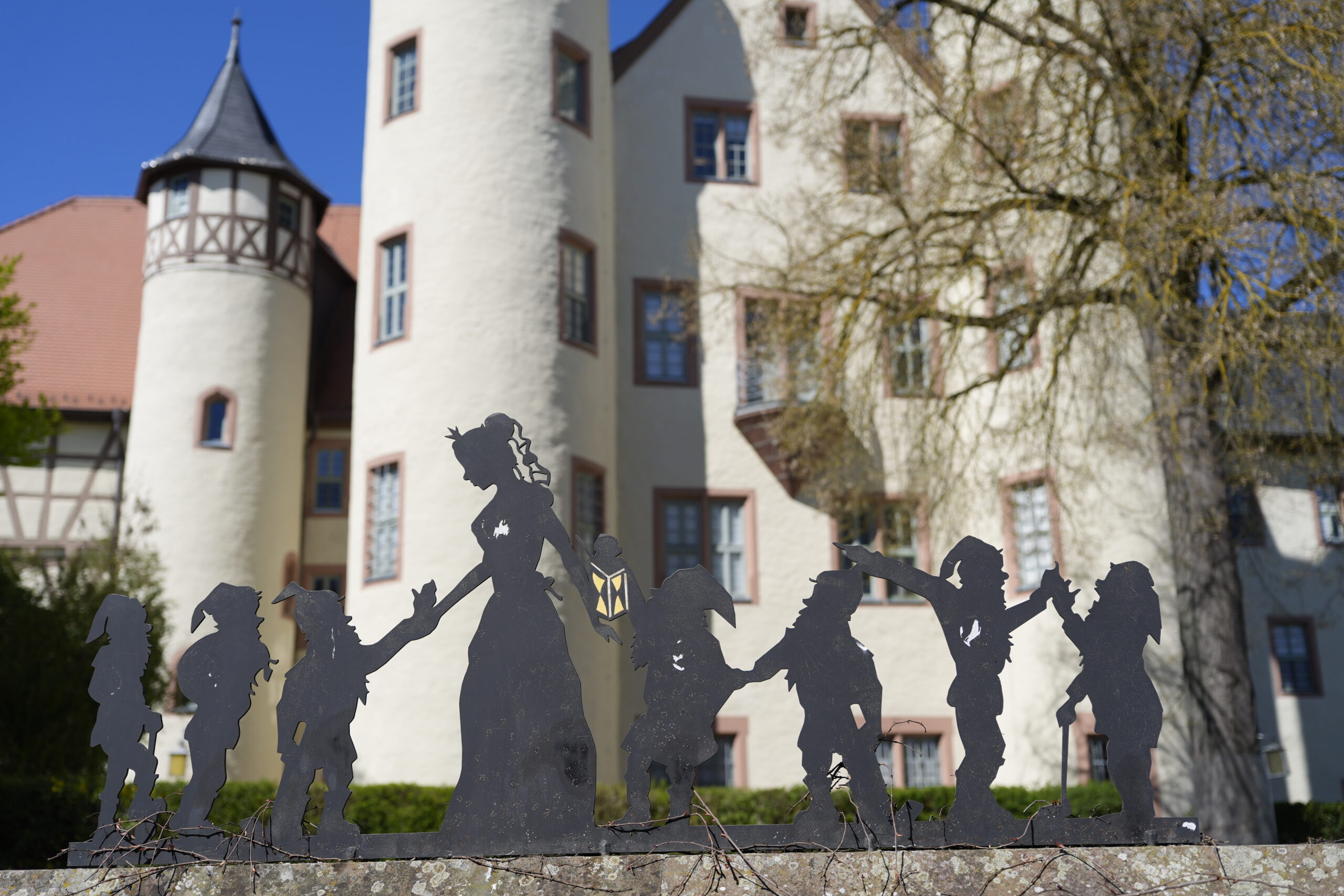 Vor dem Schloss der erste Hinweis auf das märchenhafte Lohr am Main, die Schneewittchen-Stadt: eine Gruppe, die Schneewittchen und die sieben Zwerge als Silhouette zeigt.