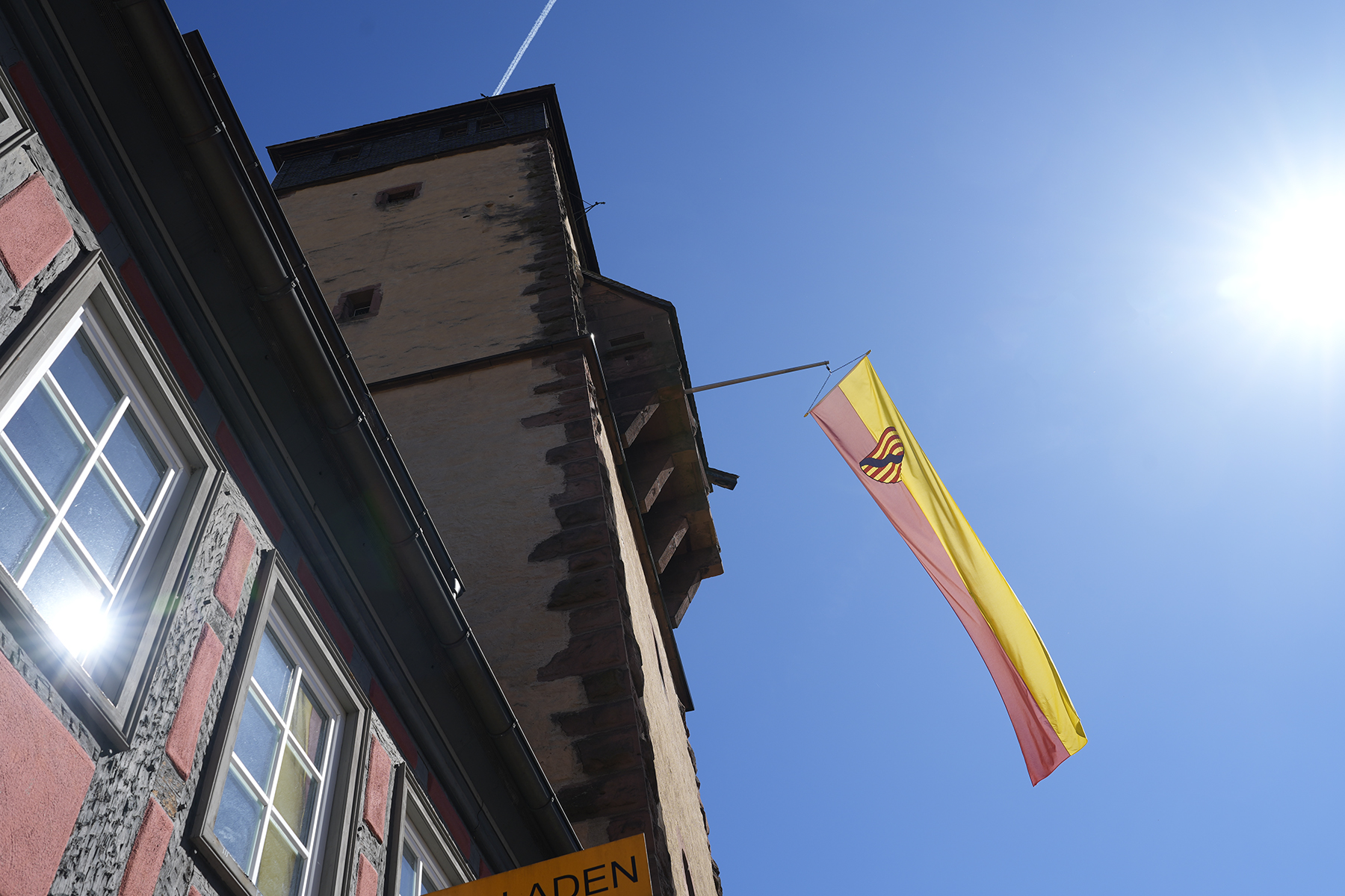 Hier weht auch die Fahne mit dem Stadtwappen.